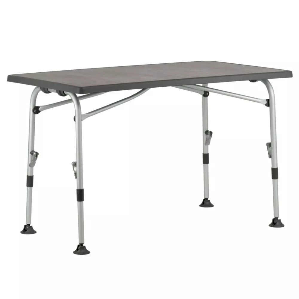 Der standfeste Camping-Klapptisch Westfield Superb 115 erscheint mit einem Gestell aus stabilem Aluminium-Rundrohr und einer wetterfesten Tischplatte in elegantem Design. Alle 4 Beine sind einzeln und stufenlos höhenverstellbar und mit einer einfach zu bedienenden Exzenterverriegelung ausgestattet. Die Tellerfüsse ermöglichen einen festen Stand, schonen den Vorzeltteppich und verhindern das Einsinken auf weichem Boden.