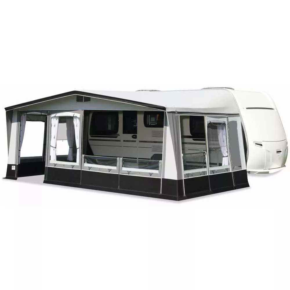 Beim Premium-Vorzelt brand Palazzo 240 kommt für das Dach und die Seitenwände ein robustes PVC-Material zum Einsatz. Die Vorderwand wird aus atmungsaktivem Ten Cate – Gewebe gefertigt. Verschliessbare Fensterklappen, Erdstreifen aussen und innen, Wetterschutzabdeckung der Reissverschlüsse, 3-fach-Seitenfenster, Gardinen und ein robustes 32 mm Stahlrohrgestänge und Vordachverstärkung vervollständigen die umfangreiche Serienausstattung. Das Design ist elegant und zeitlos. Ein ideales Wohnwagenvorzelt für alle Ganzjahrescamper.